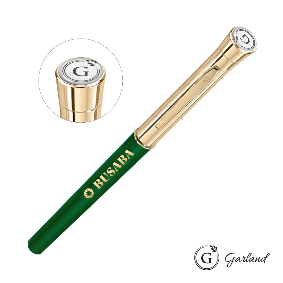 The Garland® Monogram Collection Rollerball Pen showcases timeless elegance and exceptional quality in a smooth-writing instrument designed for professionals. This metal rollerball pen features a sleek gloss-finish barrel, complemented by a gold-polished brass cap and brilliant chrome accents for a refined, sophisticated look. Topped with the signature Garland dome and filled with smooth black ink, it offers an effortless writing experience. Established in 1926, Garland pens feature brass internal components, are guaranteed for life, and come packaged to impress in an elegant gift box.Pen Size: 5.4″ W x 0.475″ H. 5.4″ W x 0.475″ H